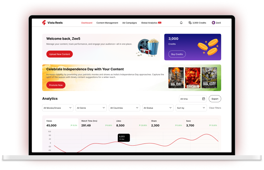 Vista Reels empowers content distributors with unmatched visibility, targeted promotion tools, real-time insights, and the ability to reach engaged OTT audiences at scale with complete control.